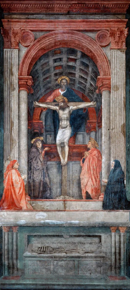 他的最后一件作品为1427年他为多明我会的圣母院绘制的《圣三位一体》(意大利语:Trinità)壁画,其中透视法应用的更为明显。他特地利用方格桶形拱顶,是具有透视错觉效果的建筑。马萨乔对文艺复兴时期的绘画有很深远的影响,首先将哥特式艺术的理想化方向扭转到反映现实方向来,他首先主动地运用透视法,力争真实地反映实际场景,表现自然和人类的真实世界。据说当时和后来相当一段时间,佛罗伦萨的所有画家都要研究他留下的壁画,以便学习“如何画靠好的规律和方法”。