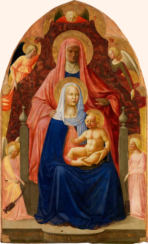 1424年,马萨乔与前辈和同样拥有哥特风格的马索利诺合作,在佛罗伦萨圣母圣衣圣殿(意大利语:Basilica di Santa Maria del Carmine)内的布兰卡契小堂(意大利语:Capella dei Brancacci)工作。马萨乔事实上和这位前辈的风格并不一致,马索利诺的风格偏向于国际哥特式艺术风格,而马萨乔更多地结合了多那太罗的三维立体风格和菲利波·布鲁内莱斯基的透视,两个人合作的第一个作品是1424年画的《圣母、圣安娜和圣婴》。
