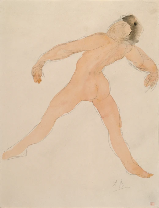 罗丹的水彩裸体画能够精准捕捉人体的动态与姿态,无论是站立、躺卧还是伸展的姿势,都描绘得栩栩如生,展现出人体在不同状态下的自然美感和力量感。他的笔触较为自由洒脱,不拘泥于传统的绘画规则。有时会用粗犷的线条勾勒出人体的大致轮廓,然后再用细腻的笔触进行局部的刻画和修饰;有时则会让水彩自然流淌和晕染,形成一种朦胧、写意的效果,为画面增添了一份随性和艺术感。这种自由的笔触使画面具有一种生动的、未完成的美感,激发观者的想象力。