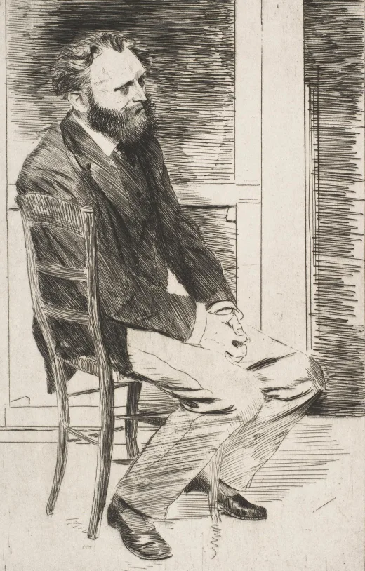 The son of a tailor, Renoir loved to depict the latest fashion trends. Here he presents a stylish woman wearing a high-collared dress, gloves, and an eye-catching hat. Despite the detailed presentation of the clothing, Renoir leaves the setting—and his sitter—largely undefined. The painting is done in a portrait format, and yet we are not sure who the woman is. Rather than a portrait of a specific person, Renoir has instead rendered a type—the modern Parisian woman.