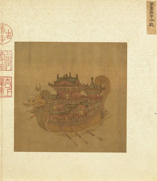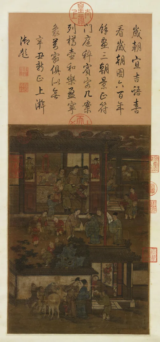 现藏美国克利夫兰艺术馆李嵩《货郎图》表现挑满玩具百货的货郎被一群孩童所欢迎,充满着民间浓厚的生活气息。 一位朴实和气的农村货郎,担上商品充盈,头上和身上也插挂着各种物件。 此画的画法比较写实,生动地表现画中人物间的情绪和互相关系。 此图笔致工细,神情刻画入微,是传世宋代风俗画中杰出作品之一。款识:嘉定壬申(1212年)李嵩画。