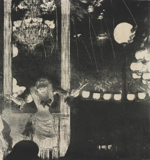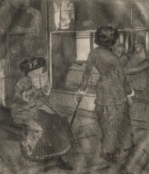 尽管德加以描绘芭蕾舞者和赛马而闻名,但他也为许多家族成员绘制了肖像。他很可能是在一次漫长的那不勒斯之行中绘制了这幅姑妈斯特凡妮娜·卡拉法(Stefania Carafa,1819 - 1901)的肖像,那里住着他的许多亲戚。据家族文献记载,这位女公爵小时候是个备受宠爱、热爱玩乐的孩子,而画中展现的却是一位坚忍、对尘世感到厌倦的女性。画中并未用昂贵的服饰来彰显她的高贵社会地位;事实上,她身着丧服,可能是为了悼念她不久前去世的兄弟阿奇勒(Achille)。Degas was a Parisian by birth, but had family connections around the world, including New Orleans and Italy. In this portrait Degas's aunt, who was a titled member of the aristocracy in southwestern Italy, is captured in loose, flowing strokes with her mourning dress and watery-eyed gaze.