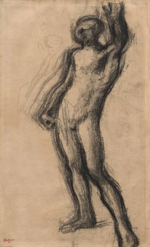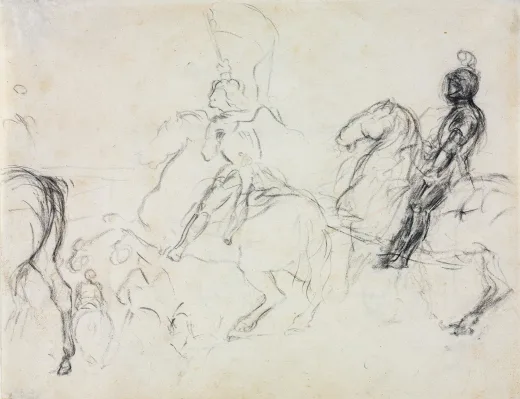Although best remembered for his depictions of ballet dancers and race horses, Degas painted many likenesses of his family members. He probably painted this portrait of his aunt, Stefania Carafa (1819–1901), during an extended visit to Naples, where many of his relatives lived. Described in family papers as a highly indulged, fun-loving child, the duchess grew into the stoic, world-weary woman depicted here. No expensive finery reveals her high social rank; indeed she wears a mourning dress, possibly to observe the recent death of her brother Achille.