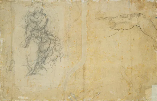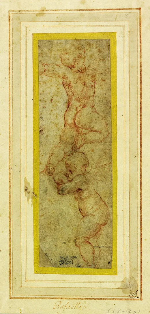 此幅画作极可能是为罗马和平圣母堂基吉礼拜堂青铜浮雕所作的最终工作底稿,十八世纪时曾被人工描摹以作保护。观者需凝神细察,方能从粉调底纸上辨识拉斐尔银针笔的原始线条。在此过程中,我们得以发现:大师不仅以适合浮雕的布局勾勒人物轮廓,更通过精细排线塑造立体质感。