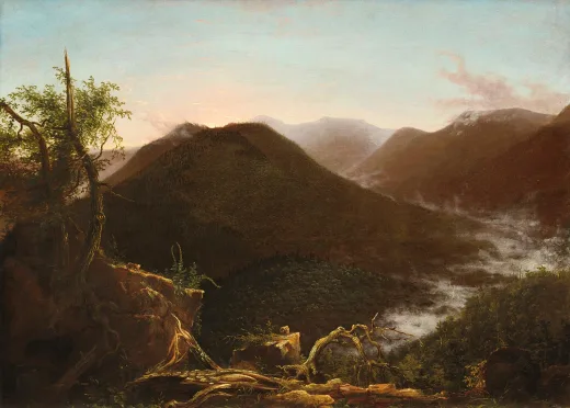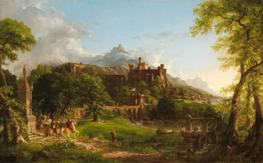Cole's renowned four-part series traces the journey of an archetypal hero along the "River of Life." Confidently assuming control of his destiny and oblivious to the dangers that await him, the voyager boldly strives to reach an aerial castle, emblematic of the daydreams of "Youth" and its aspirations for glory and fame. As the traveler approaches his goal, the ever-more-turbulent stream deviates from its course and relentlessly carries him toward the next picture in the series, where nature's fury, evil demons, and self-doubt will threaten his very existence. Only prayer, Cole suggests, can save the voyager from a dark and tragic fate.