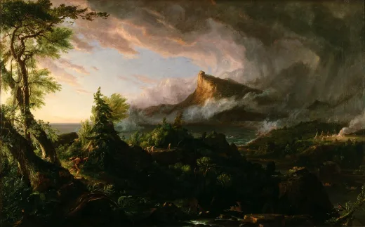 From the innocence of childhood, to the flush of youthful overconfidence, through the trials and tribulations of middle age, to the hero's triumphant salvation,The Voyage of Lifeseems intrinsically linked to the Christian doctrine of death and resurrection. Cole's intrepid voyager also may be read as a personification of America, itself at an adolescent stage of development. The artist may have been issuing a dire warning to those caught up in the feverish quest for Manifest Destiny: that unbridled westward expansion and industrialization would have tragic consequences for both man and nature.