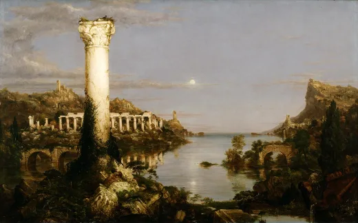 科尔著名的四连作系列画作描绘了一位典型英雄在“生命之河”上的旅程。这位旅行者自信地掌控着自己的命运,对前方的危险浑然不觉,大胆地奋力驶向一座空中城堡,这座城堡象征着“青春”的幻想,以及对荣耀和声名的渴望。当旅行者接近目标时,水流变得愈发湍急,河道也偏离了方向,无情地将他带向下一幅画的场景,在那里,大自然的愤怒、邪恶的恶魔和自我怀疑将威胁到他的生存。科尔暗示,唯有祈祷能将这位旅行者从黑暗而悲惨的命运中拯救出来。